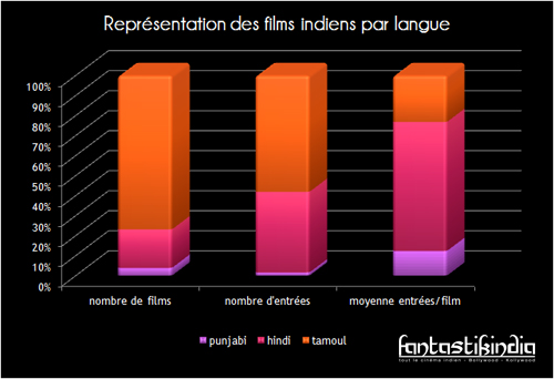 Le cinéma tamoul est le plus présent en France et cela est dû à une forte communauté fidèle à la salle de cinéma, mais les films hindis marchent mieux en moyenne. Tout comme les films en VOSTF, par rapport aux films en VO et VOSTA. Les films en VOSTF correspondent à ceux des grandes stars, ce sont ceux qui marchent le mieux.