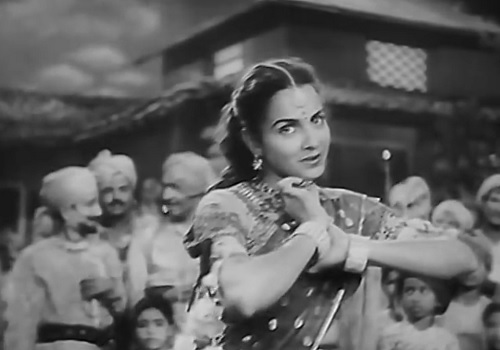 Raj Kapoor, à la recherche d’une influence occidentale pour Barsaat en 1949, saura utiliser son côté « exotique » en lui permettant de réaliser un des premiers, sinon le premier, numéro de cabaret de Bollywood. L’orchestre et quelques spectateurs immobiles sont présents autour de la piste où elle commence par un solo de plus de deux minutes, avant qu’un Premnath un peu lourdaud arrive pour la faire virevolter. Mais elle ne danse pas pour son partenaire à l’écran, c’est à nous qu’elle s’adresse en fixant la caméra d’un œil charmeur. Même les paroles de Shailendra chantées par Mukesh semblent vanter sa beauté et sa jeunesse : Patali Kamar Hai Tirachhi Nazar Hai (Ta taille fine, tes yeux pétillants).