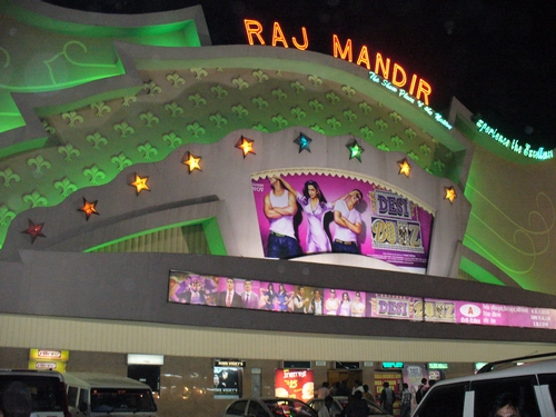 Me voici donc en cette fin d’après-midi du 25 novembre, parcourant les grouillantes et interminables rues commerçantes de Jaïpur à l’arrière d’un cyclo-pousse, en direction du Raj Mandir, la célèbre salle de la ville. Guettant l’apparition de la façade au détour de chaque rue, j’imagine surgir la silhouette de Ra.One ou le visage de Rockstar, les affiches de ces deux films ayant maintes fois été aperçues ces derniers jours.