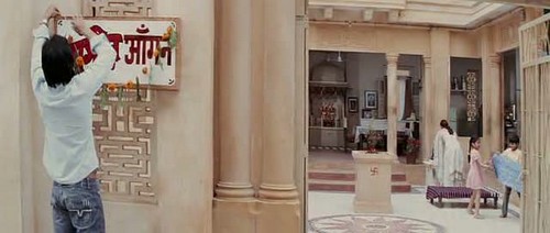 Les similitudes entre les deux films ne s’arrêtent pas à l’histoire. Le couple Isha Koppikar / Sonu Sood évoque irrésistiblement le couple Amrita Rao / Shahid Kapoor. Et ce n’est bien entendu pas un hasard. Kaushik Ghatak dont c’est la première réalisation mais qui doit être surveillé de près par Sooraj Barjatya, joue à fond sur les symboles et l’inconscient des spectateurs. Tout ce qui a déjà façonné le spectateur de Vivah est récupéré. Jusqu’à l’affiche. La simple comparaison entre les affiches de Vivah et d’Ek Vivaah… aisa bhi est explicite. On y voit uniquement les deux personnages principaux. Ils ont la même coiffure, le même sourire, le même regard vers le bas. Le point d’accroche est le même : la femme. Habillée en rouge dans l’un (alors que Shahid est en blanc sur fond blanc). Habillée en blanc dans l’autre (alors que Sonu est en bleu sur fond sombre). Seule différence, une composition verticale et dépouillée dans Vivah et une composition horizontale qui permet de donner une place à la ville (dans toute sa tradition) avec Ek Vivaah… aisa bhi.
