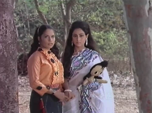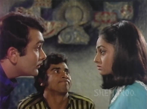 Commençons par le plus évident, Randhir Kapoor. Il avait fait ses débuts d’acteur adulte l’année précédente dans le film familial Kal Aaj Aur Kal qui avait moyennement marché. Cependant, il y avait rencontré l’actrice Babita qu’il avait presque épousée sur le champ ! En vérité, la carrière du père de Karishma et Kareena Kapoor n’ira pas vraiment plus loin. On peut même dire qu’en 1972 elle est à son apogée avec quatre films, dont Raampur Ka Lakshman et Jawani Diwani, tous deux dans le top 10 de l’année. Jouer ne devait pas être sa vocation, semble-t-il. Ici, il a beau singer son père (dont il est celui des fils qui lui ressemble le plus), ce n’est jamais qu’une caricature et à aucun moment il ne dégage l’aura de papa Raj. Quant à son alchimie avec Jaya Bhaduri, elle est nulle. Il ne se passe rien. Elle est charmante comme toujours, expressive et bonne actrice, mais elle ne peut sauver ce couple bien mal assorti. Si je résume, Randhir n’est donc pas bon dans les scènes de cabotinage, il est insipide dans les scènes de face à face et ne parlons pas des scènes d’action qui en plus sont très mal montées. Il ne nous épargne rien.