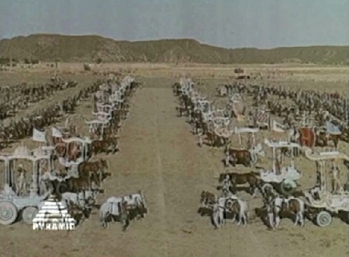 La mise en scène montre elle aussi clairement l’influence du théâtre. Mais il ne faut pas oublier qu’à l’époque le cinéma était un vecteur nouveau pour ces récits mythologiques. Pendant des siècles ils se sont transmis par le théâtre populaire, et à l’époque l’Inde n’étant pas aussi ouverte que maintenant aux médias étrangers, c’était le théâtre qui était le point de comparaison privilégié pour faire une adaptation. Toutefois ce film a bénéficié de moyens importants, avec de nombreux décors et une reconstitution du combat final en décors naturels. Il s’agissait en effet d’une co-production bilingue en tamoul et telugu, un fait courant à l’époque surtout pour les films mythologiques, puisque tout le monde en Inde les connait. Si certains passages font très ‘théâtre filmé’, la mise en scène s’en écarte finalement assez souvent, avec de longs passages-clés tournés en extérieur qui dynamisent vraiment le récit. Certains moments sont même assez étonnants pour l’époque au niveau des effets spéciaux, comme le passage où Karnan recoit l’enseignement du sage Parasuraman, ou la mise en scène de sa mort.