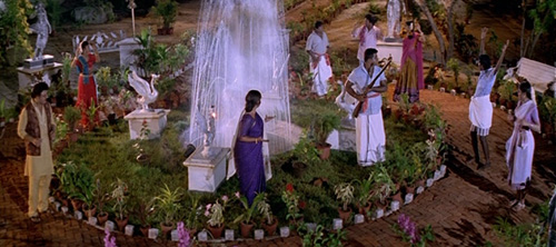 S’ajoute à cela plusieurs chansons assez originales : la première, particulièrement exaltante avec cuivres façon "entrée des gladiateurs" présentant le héros au ralenti, une autre rythmée par le hoquet d’une femme (il fallait oser !), la suivante sur le thème des couleurs où acteurs et décors changent quasiment à chaque plan… le tout composé par le Mozart de Madras, A.R. Rahman.