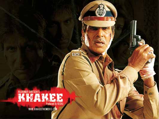 Mais son film-phare des années 2000 est incontestablement Khakee en 2004. Certes, on y retrouve son nouvel acteur fétiche Devgan dans un rôle de méchant d’anthologie (une constante dans les films du minutieux cinéaste), mais ce très bon polar réaliste constitue avant tout un rôle en or pour Amitabh Bachchan, parfait en policier proche de la retraite chargé d’escorter un terroriste jusqu’au tribunal. Malgré quelques petites longueurs, ce multi-starrer (Akshay Kumar et Aishwarya Rai figurent également au générique) est l’un des films les plus riches de son réalisateur, qui fait pratiquement un sans-faute : excellente direction d’acteurs, sens de l’action, répliques qui font mouche, scénario plein de rebondissements, fin troublante, chansons rares qui passent à l’arrière-plan pour donner la priorité à l’intrigue policière… Mais Khakee est encore plus qu’un simple polar à succès, c’est le film-somme de Santoshi, à la fois film-dossier engagé sur la police indienne, nous présentant plusieurs portraits de flics assez fins dont la psychologie évolue au cours du film, et nouvelle variation sur le thème du western, cette fois-ci avec le sous-genre du « film d’escorte » ; il se démarque ainsi de ses westerns précédents, au scénario plus proche de Sholay, tout en confiant la vedette au héros de ce dernier, Amitabh, qui devient alors l’angry old man favori des Indiens.