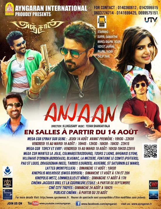 Il sera donc question de gros flingues, vendettas, bastons, mais aussi d’humour et de romance, dans Anjaan qui sort en France, grâce à notre partenaire AYNGARAN INTERNATIONAL à partir du 14 août 2014. De nombreux cinémas, dont ceux du réseau MEGA CGR, accueilleront le film en VOSTFR.