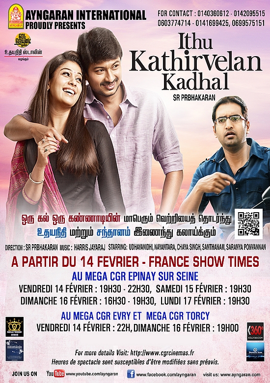 Notre partenaire, AYNGARAN INTERNATIONAL, vous propose de découvrir cette comédie romantique à partir du 14 février 2014. Nous vous rappelons que Idhu Kathirvelan Kadhal sera projeté en VOSTFA (sous-titré en anglais), dans les Mega CGR d’EPINAY SUR SEINE, EVRY et TORCY.