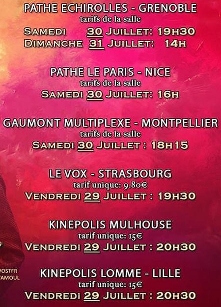 Vient s’ajouter à cette liste une troisième séance exceptionnelle, toujours à l’EuropaCorp Cinémas Aéroville, en salle 7, le jeudi 21 juillet à 21h30. Pour les teluguphones, le film sort également dans une version telugu au Brady. Enfin, nous avons une première liste de salles françaises qui participent à cette grande fête.
