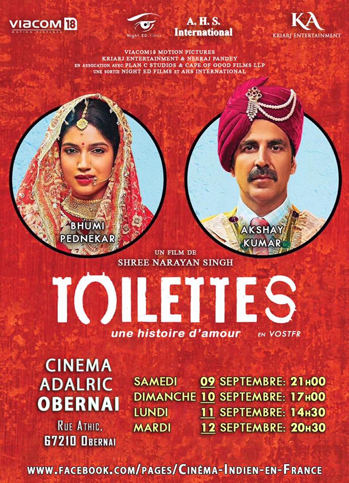 Toilettes : une histoire d’amour, emprunte le même thème que Joker, mais avec une note plus légère et comique. Keshav et Jaya, fraîchement mariés, viennent de deux villages touchés par le même fléau : la pénurie de toilettes due aux vieilles traditions, idées reçues et défaillances du système. Jaya quitte rapidement son mari, en découvrant que le foyer familial est dépourvu de sanitaire. Cette séparation va lancer la croisade de Keshav, pour un meilleur accès aux W.C. et sauver par ce biais, son mariage avec Jaya. En tête d’affiche de cette comédie sociale, on retrouve l’infatigable Akshay Kumar et la jeune Bhumi Pednekar révélée en 2015 par le succès surprise de 2015, Dum Laga Ke Haisha.