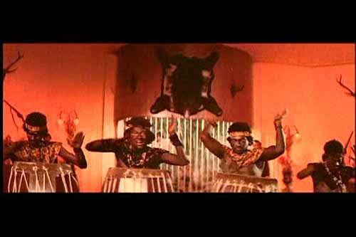 Le film vaut également le coup d’œil et son pesant de cacahuètes pour quelques chansons extravagantes : on peut en mentionner une avec un homme déguisé en Superman sur un décor de plateau télé, et une autre d’encore plus mauvais goût précédant le climax, dans la salle de séjour du méchant, qui met en scène de vrais-faux percussionnistes africains chargés de la section rythmique du morceau, tandis que Sanjay et sa belle sont prisonniers à l’arrière-plan derrière des barreaux. Subhash Ghai a réussi ici à aller encore plus loin que dans les fameuses séquences chantées et dansées de Karz, qui étaient déjà complètement délirantes mais qui, grâce à leur bonne musique disco, étaient vraiment jubilatoires et ne sombraient pas pour autant dans une telle caricature.